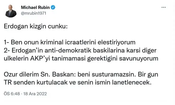RESMEN TEHDİT ETTİ ABD'li Rubin, "@mrubin1971" uzantılı resmi Twitter adresi üzerinden yaptığı paylaşımda "Bir gün Türkiye senden kurtulacak ve senin ismin lanetlenecek." şeklinde alçak söylemlerde bulundu. "Erdoğan kızgın çünkü: